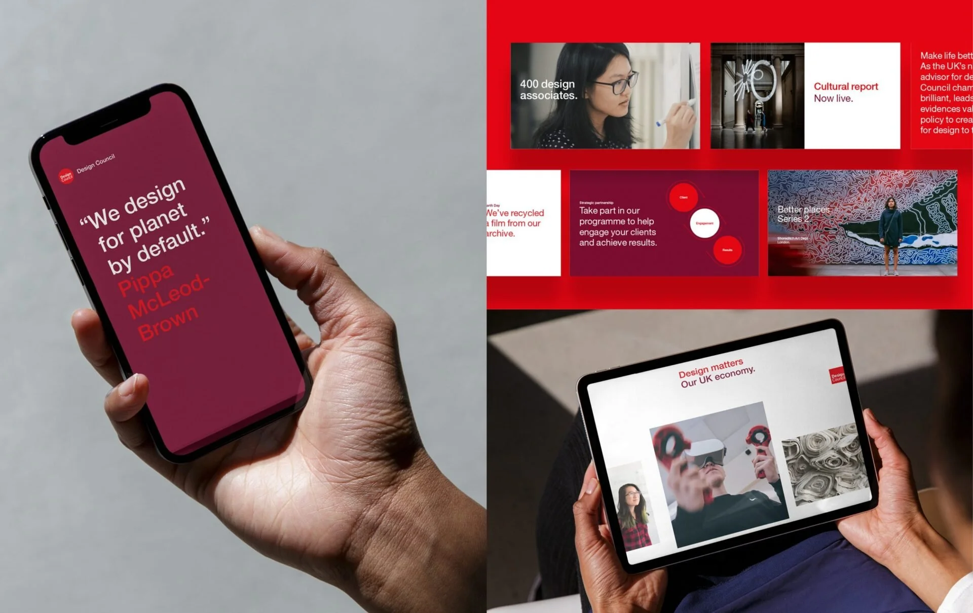 Third example: The ecological footprint of companies is becoming increasingly important and is gradually entering the visual identity and broader behavior patterns of companies. In the recently completed brand update of the Design Council, the goal was to achieve the smallest possible footprint, thereby supporting the Design for the Planet movement. Although the Design Council had previously used red as its main color, it was found that red is the most efficient color mix for printers after pure tones. In addition, it was decided to reduce the use of large images in the visual identity for the same reasons. The image material was made smaller and covered with a red-based filter, making the entire material consistently supportive of the colors and more efficient when mixed by printers.